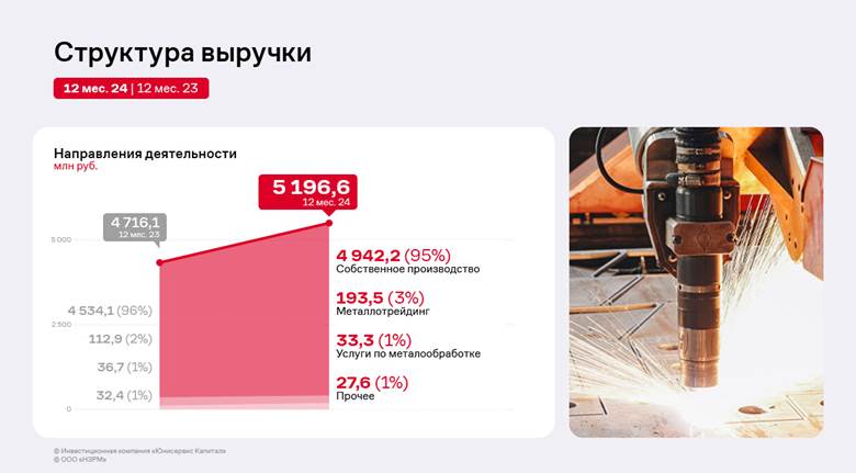 В 2024 году структура выручки ООО «НЗРМ» практически не изменилась относительно прошлых периодов. Изготовление и реализация продукции собственного производства по-прежнему остаётся ключевым направлением деятельности, доля которого составляет 95%. Дополнительно эмитент занимается металлотрейдингом, а также успешно оказывает услуги по металлообработке.