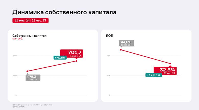 Собственный капитал на конец 2024 года вырос на 47,6% относительно АППГ и составил 701,7 млн руб. Собственный капитал продолжает увеличиваться за счёт роста нераспределенной прибыли: вся чистая прибыль компании ежеквартально реинвестируется в развитие.