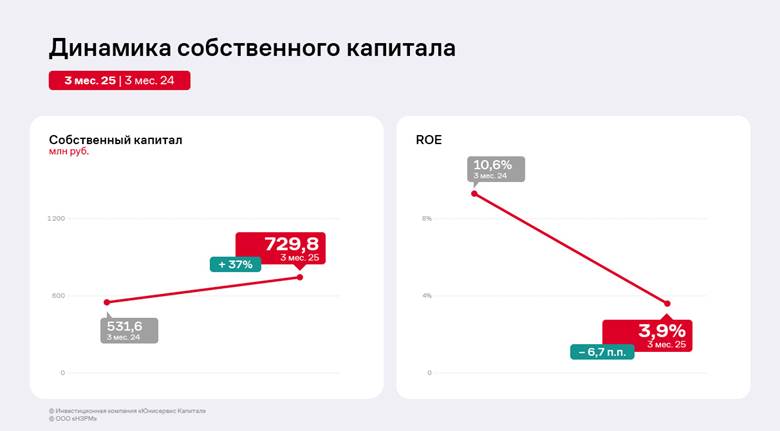 Рентабельность собственного капитала (ROE) в отчётном периоде находится на уровне 3,9%, снизившись относительно АППГ на 6,7 п.п. Причины — сокращение чистой прибыли при отстающем росте собственного капитала.
